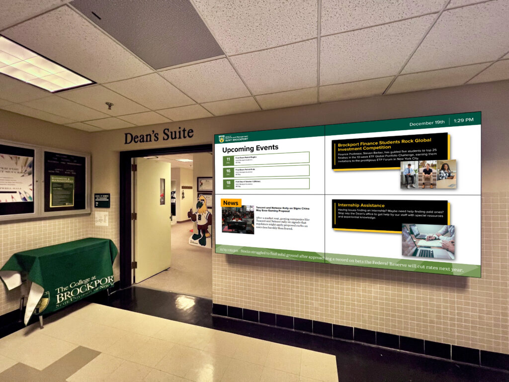 Brockport, New York – December 20, 2023 — Empire Digital Signs, a top-tier provider of cutting-edge visual display solutions, is excited to declare its partnership with SUNY Brockport’s School of Business. The institution has chosen Empire Digital Signs to elevate its communication with the informational hub. The installation of a state-of-the-art video wall reflects the shared commitment to advancing educational technology.